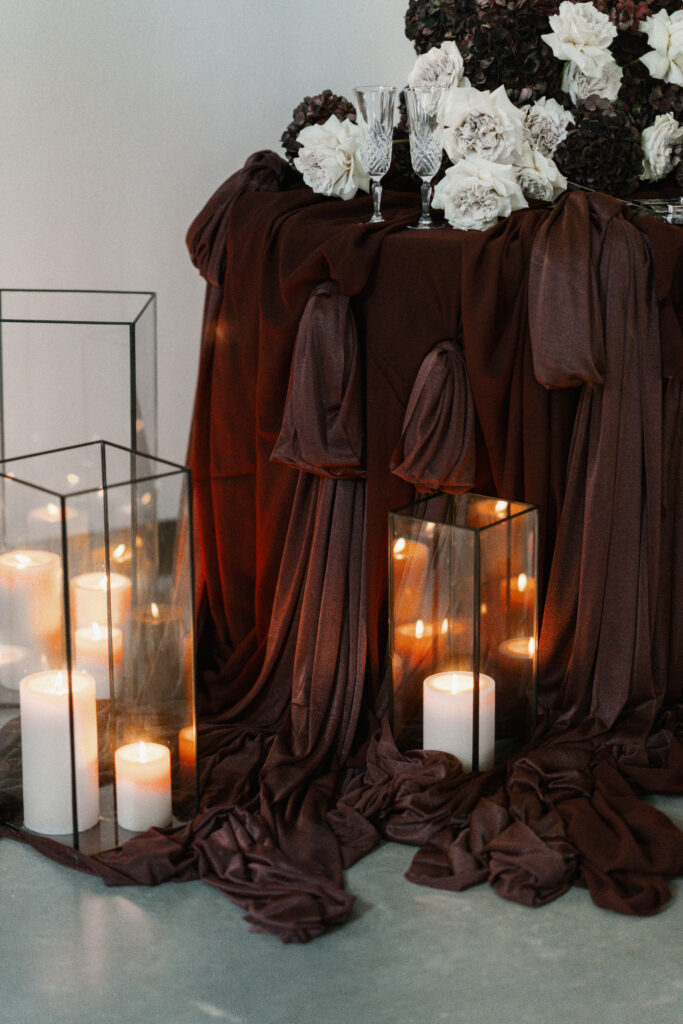 The greenhouse reception shoot was a true highlight, unveiling a sea of custom draped tables in soft white fabric. Rich, moody floral centerpieces in autumnal hues complemented towering candles, casting a golden glow over the space. The result was a warm, inviting, and elegant atmosphere, perfect for an intimate celebration with an elevated touch.